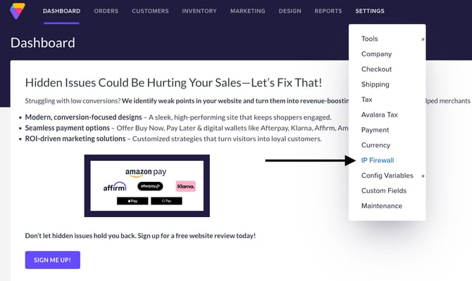 Navigate to Settings > IP Firewall from the Dashboard of your Volusion store's Admin.
