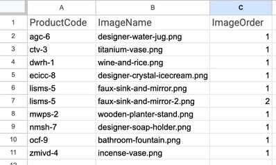 Column C the order in which you'd like the images to appear on the product page. If you're uploading multiple images for a single product (even if only one image is being uploaded per product, the column is still required, and a "1" should be listed as the value in that cell if it is the only image for the product). This column should include the Header: ImageOrder