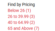 The price ranges shown in the Find by Pricing filter will depend on the number of results and the total range of prices. For example, if you have products ranging in price from $12 to $105, products might be broken down into the following: