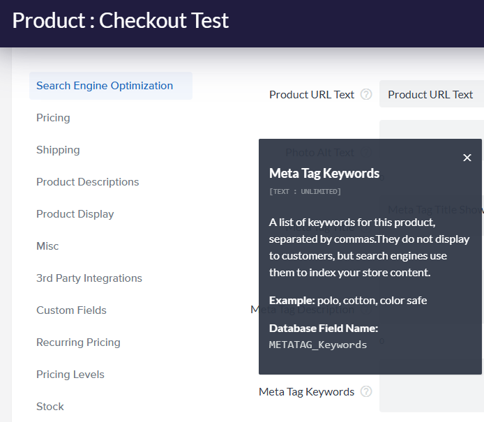 The Meta Tag Keywords field is a list of keywords for this product, separated by commas. They do not display to customers, but search engines use them to index your store content.