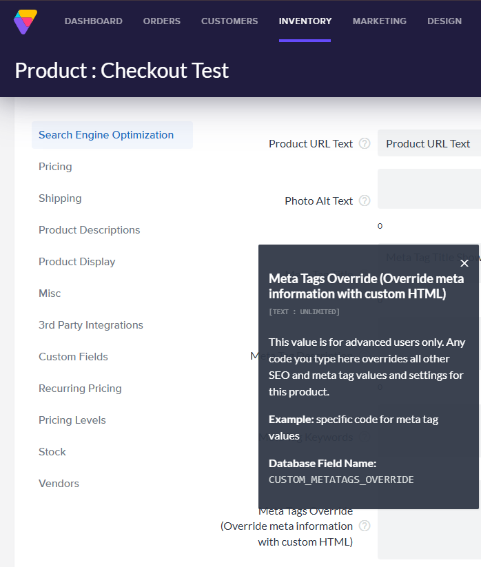 The Meta Tags Override field is for advanced users only. Any code you type here overrides all other SEO and meta tag values and settings for this product.