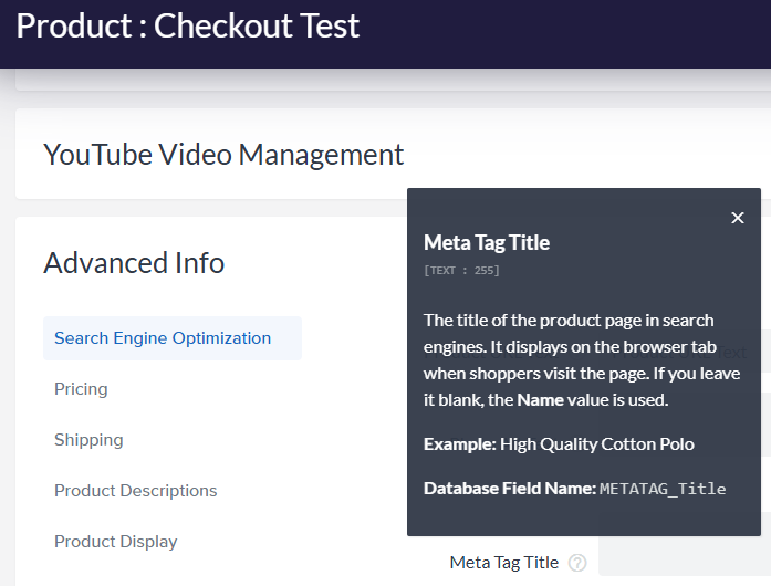 The Meta Tag Title field is the title of the product page as presented to Search Engines.