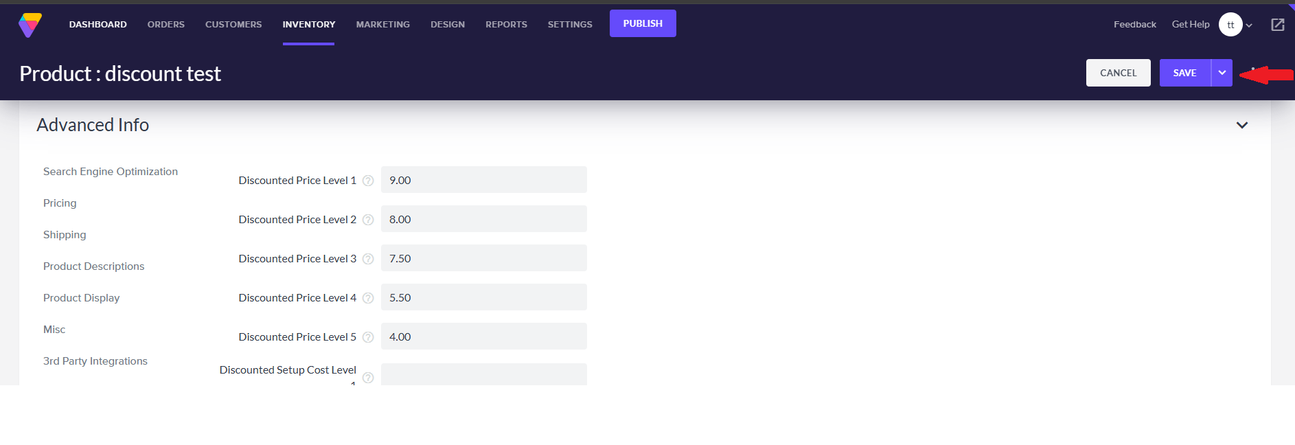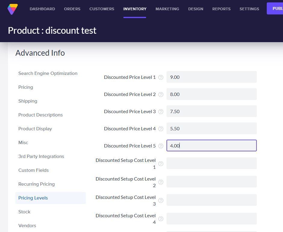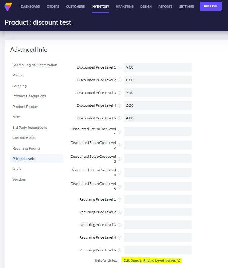 All products have a special Pricing Levels section. Here, you enter a price for the one or more levels of discounted prices offered for a particular product.