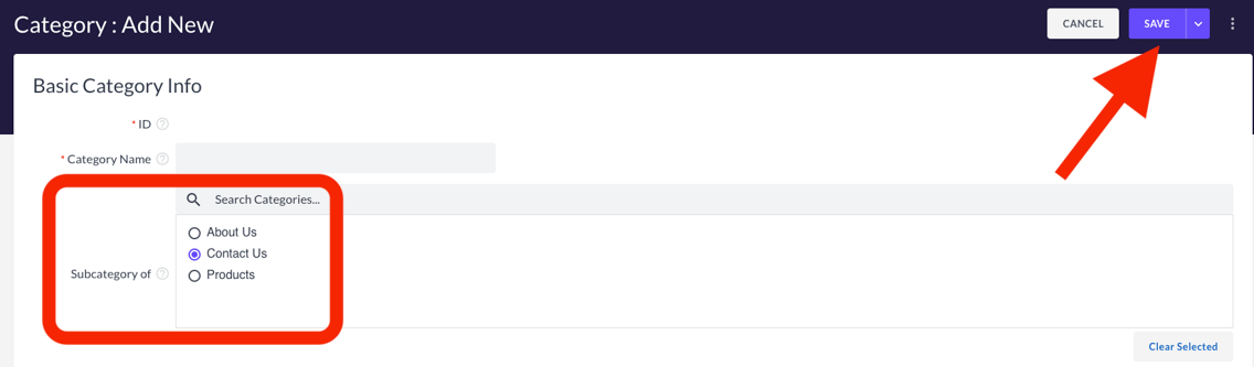 In the Subcategory of section use a radio button to choose the Parent Category for your new Subcategory. Click the Save button at the top right when complete.