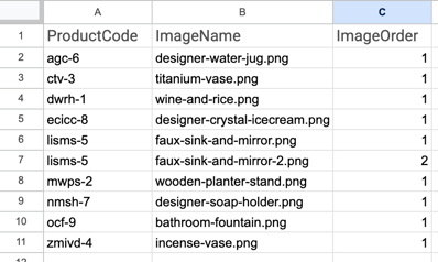 Column C �� the order in which you'd like the images to appear on the product page. If you're uploading multiple images for a single product (even if only one image is being uploaded per product, the column is still required, and a "1" should be listed as the value in that cell if it is the only image for the product). This column should include the Header: ImageOrder
