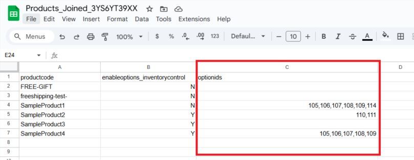 In the OptionIDs column of the Products CSV file, fill in the option ID numbers for each product. Each ID number should be separated by a comma (no spaces).