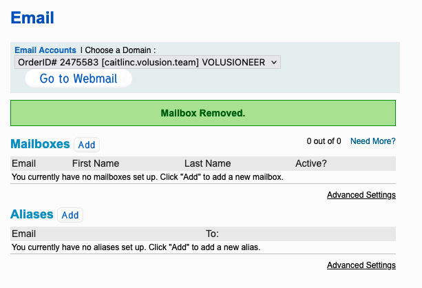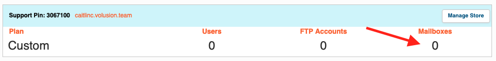 To confirm that your hosting plan has zero (0) mailboxes, click the Volusion logo to return to your myVolusion account overview. Under Account Information, you should see a "0" in the Mailboxes column. If you see any other number, reread the steps in this section to ensure you've deleted all mailboxes for the relevant hosting plan(s).