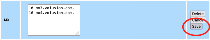 Locate the existing entry for Volusion's MX records (mx3.volusion.com and mx4.volusion.com) and the "mail" CNAME record.