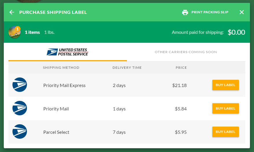 Press Buy Label next to the selection of your choice. On the label review dialog box, you'll see: the shipping method, the cost, the shipping address, the return address, your preferred label file format selection (you can change it for an individual order here), your default selection for return postage printing (you can change it for an individual order here), and your payment method (click Edit to change your default payment method).