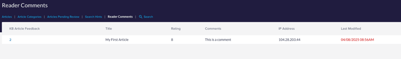 When a customer submits a comment, the comment is entered into the Reader Comments table in the Admin Area. You can review comments by selecting Reader Comments from the Filter menu near the top of the Knowledge Base table.