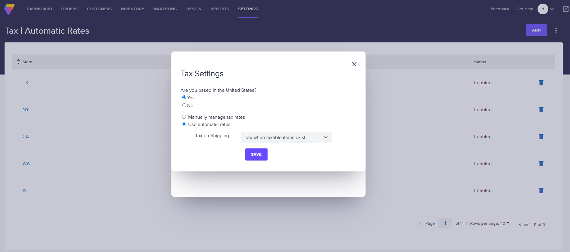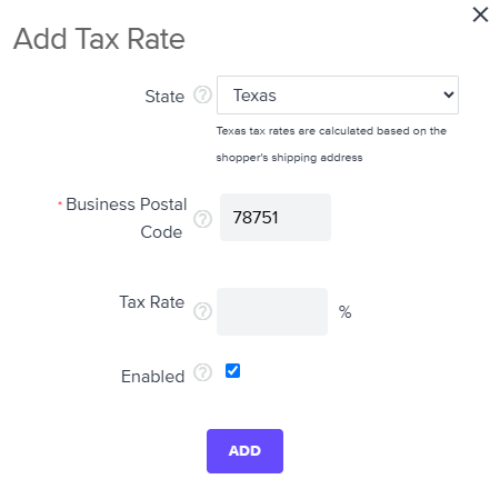 To create an automatic tax rates for a state, click Add at the top of the page to open the Add Tax Rate popup and make a selection from the State and Business Postal Code dropdown menus. Click Add to close the pop-up and add the tax rate to your store.