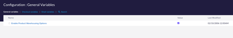 Make sure the Enable Product Warehousing Options variable is active. To find it quickly, click Search and enter "Warehousing" in the Name field.