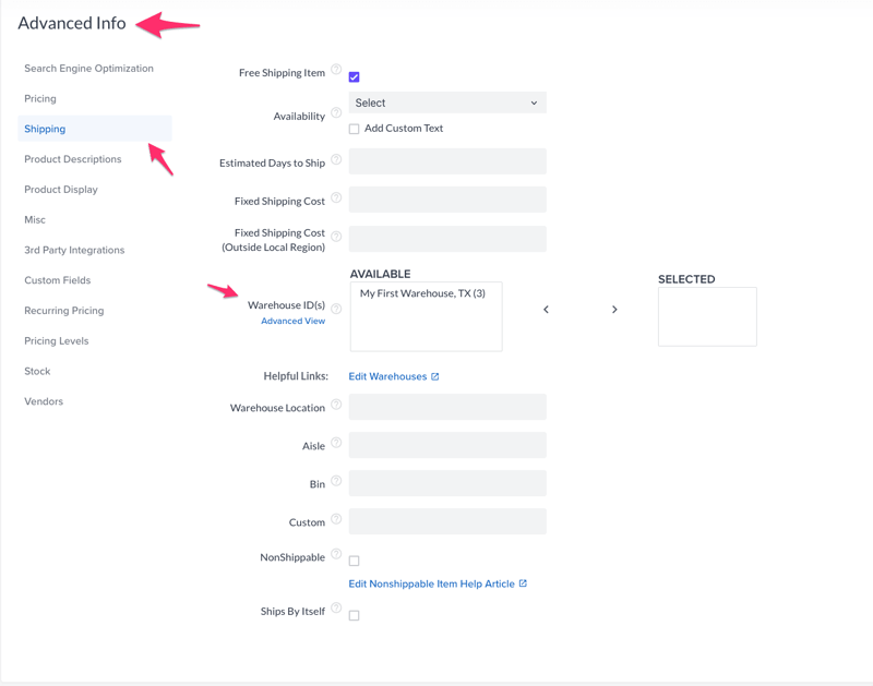 You can now assign a product to a warehouse in the Shipping tab of the Advanced Info section. To assign a Warehouse, click it in the Available section, click the right facing arrow and it will now be listed in the Selected section.