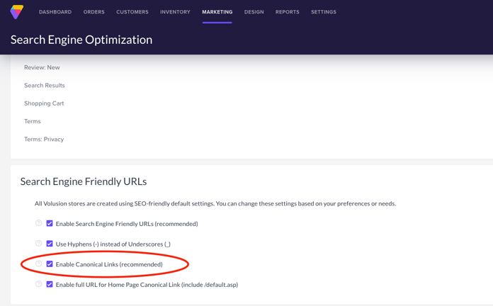 To ensure that your /default.asp URL is getting the best SEO value, it's a good idea to verify that your store is using canonical tags. You can do this by heading over to Marketing > SEO and locating the Search Engine Friendly URLs section.